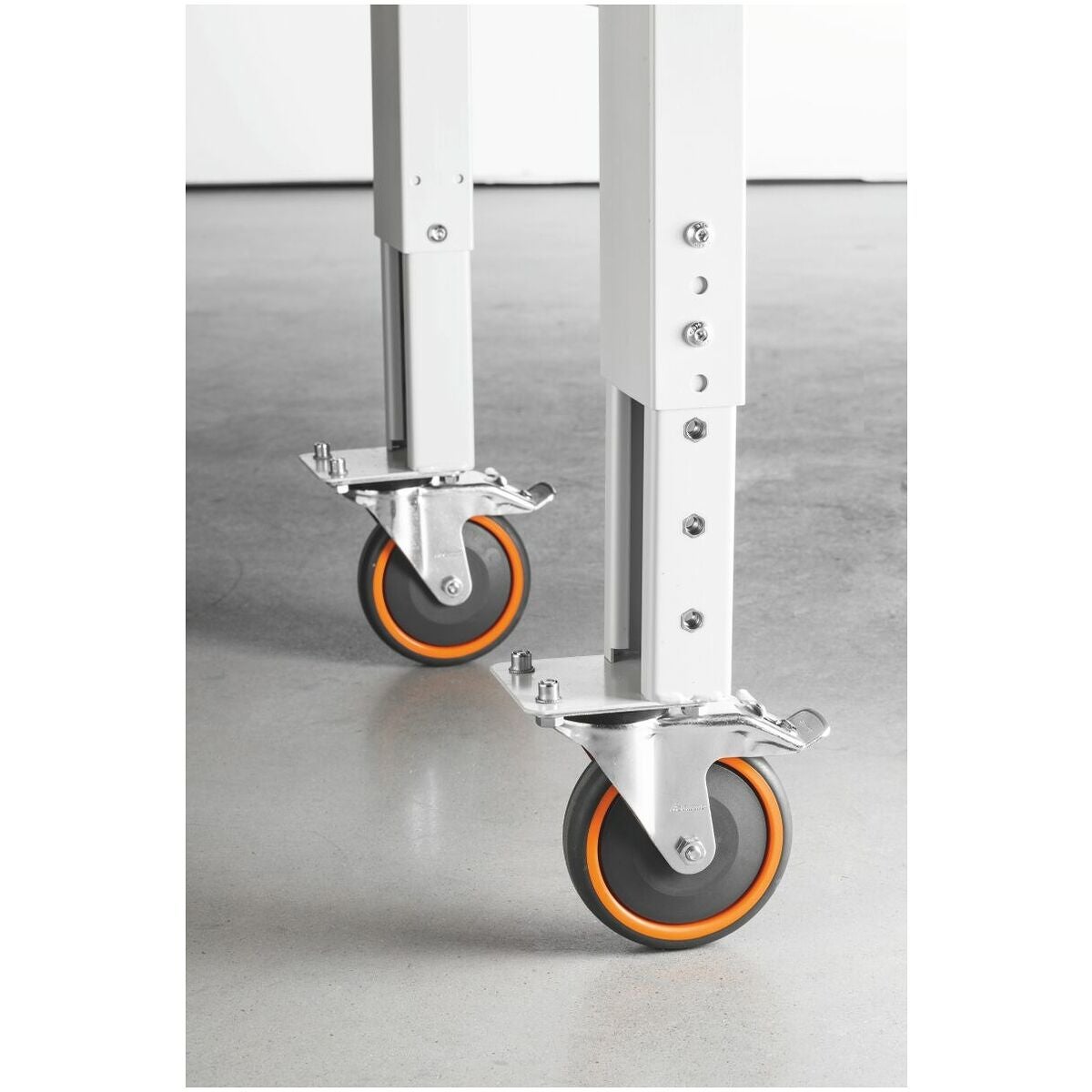 Manuell höjdjustering som inskjutsmodul i arbetsbänkens fötter, inklusive hjul ⌀ 125 mm. Trådskydd förhindrar att hjulen låser sig. Optimalt lugn gång tack vare högklassiga kullager med omönstrad polyuretanlöpyta, minsta möjliga rullmotstånd och låg åkljudnivå. Hjulställets största bärförmåga är 100 kg, och det får inte monteras på stödben med 900 mm höjd. Kan inte kombineras med Ready-to-go arbetsbänkar. Höjdjustering i 25 mm raster möjlig.