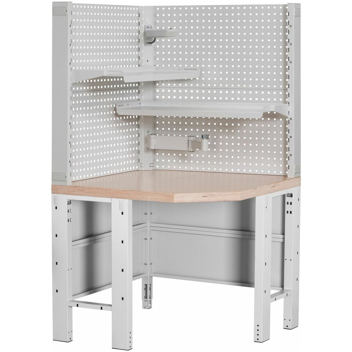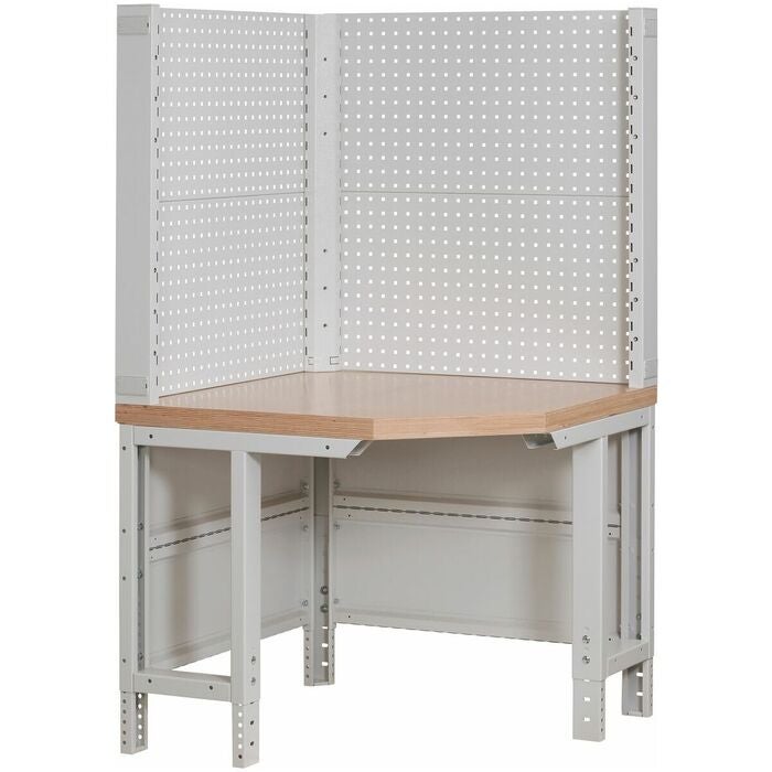 Av robust stålplåt. Arbetsyta utan hinder eftersom montaget sker utan knutplåtar.