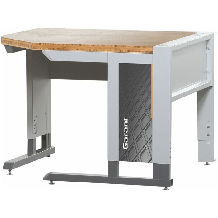 Hörnarbetsplats för workstation. Höjdinställning i 25 mm-raster genom fotdel med fixeringsskruvar. Med benställning av stålplåt och fyrkantrör, bärförmåga 250 kg.