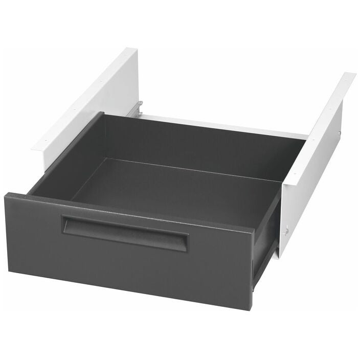 Av stålplåt med lättgående hjul av Delrin. För montering under arbetsskivan.