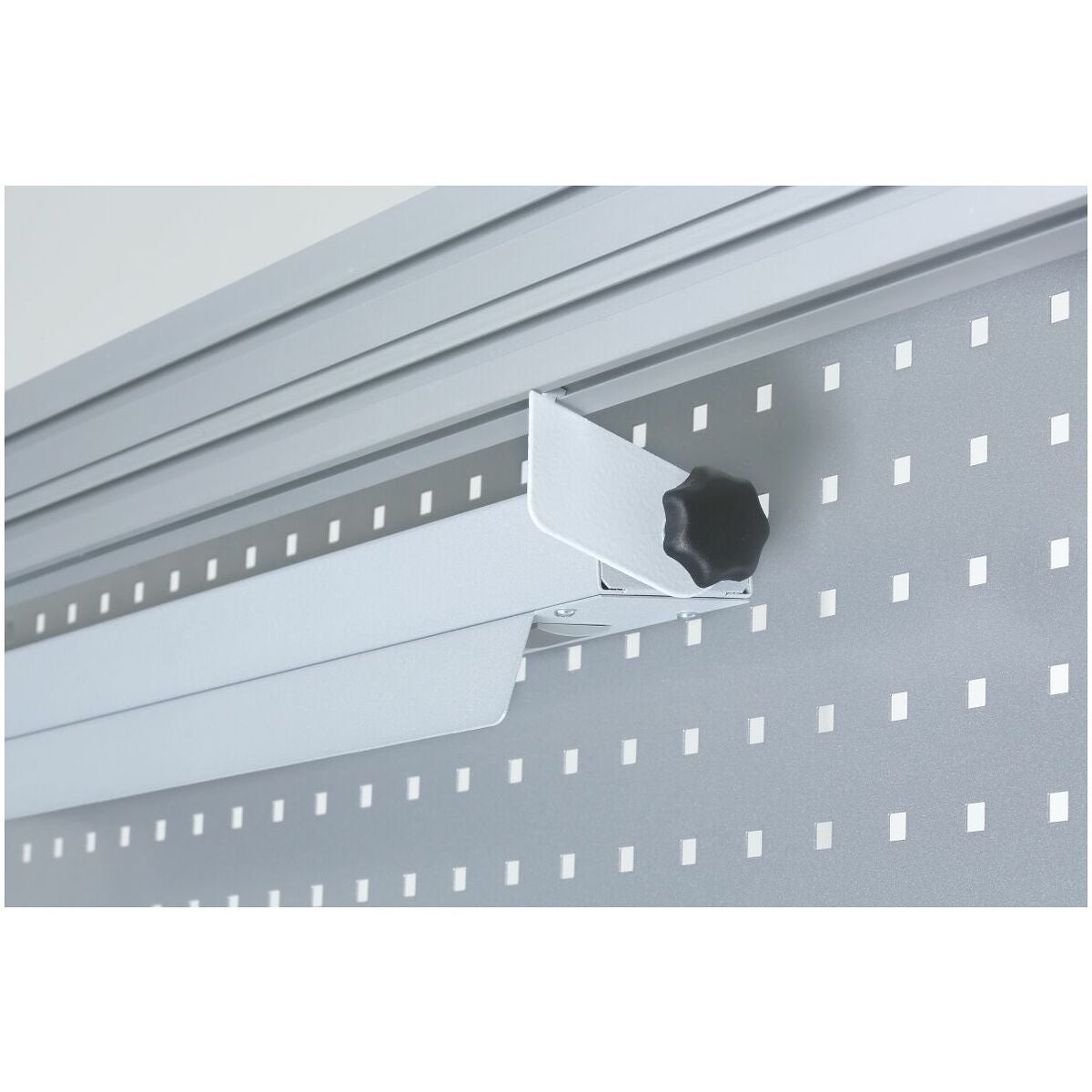 LED-belysningsarmatur för fastsättning i multifix-skenor. Montering med hjälp av vinkel som sätts fast på sidan med hjälp av ett T-spår-fäste. Kåpa av stålplåt i ljusgrå. Var och en av de olika armaturerna medger steglös justering och går att slå på och stänga av med hjälp av inbyggda strömbrytare.