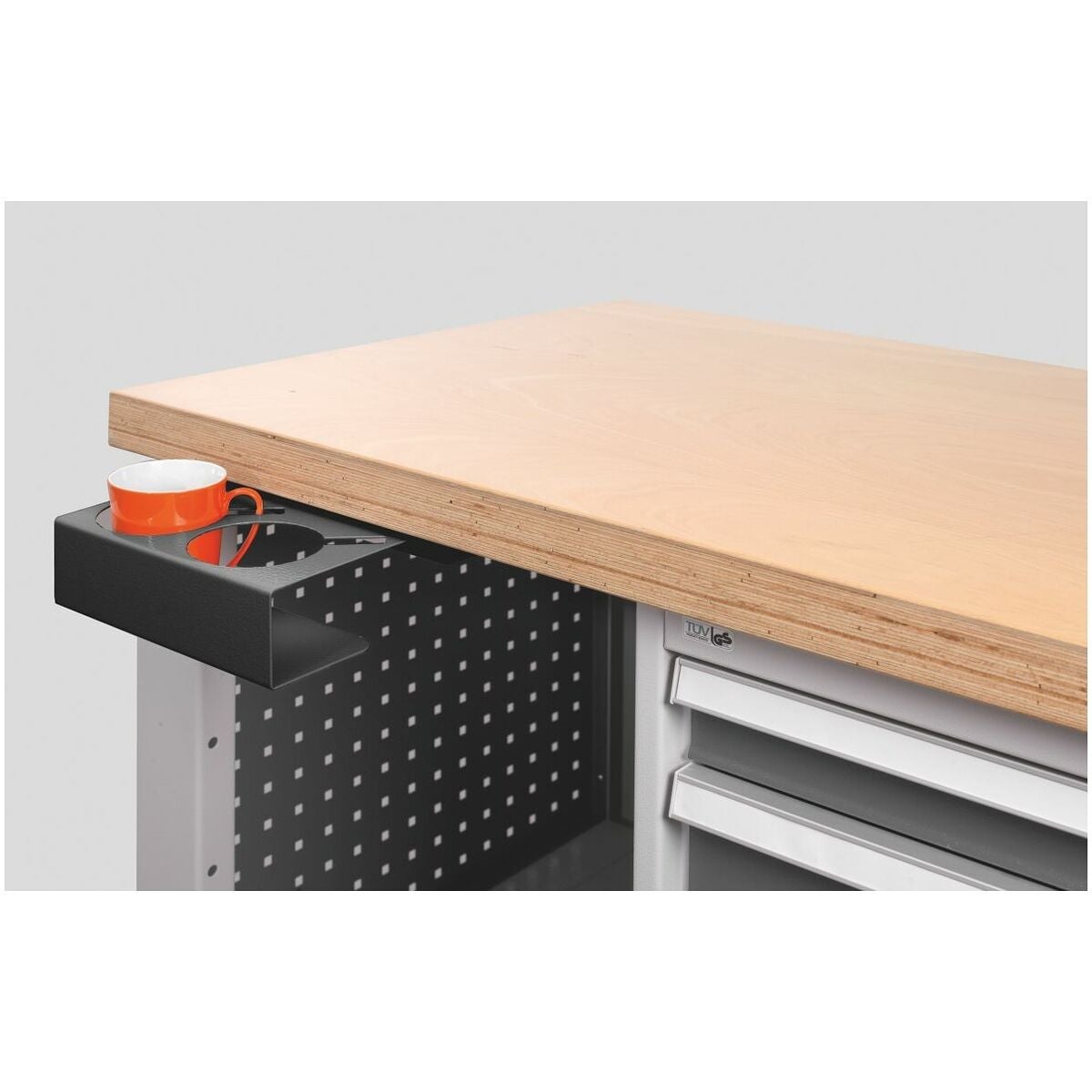 Mugghållare för montering under bänkskivan på arbetsplatsen. Våra mugghållare har ett urtag för muggarnas öra.