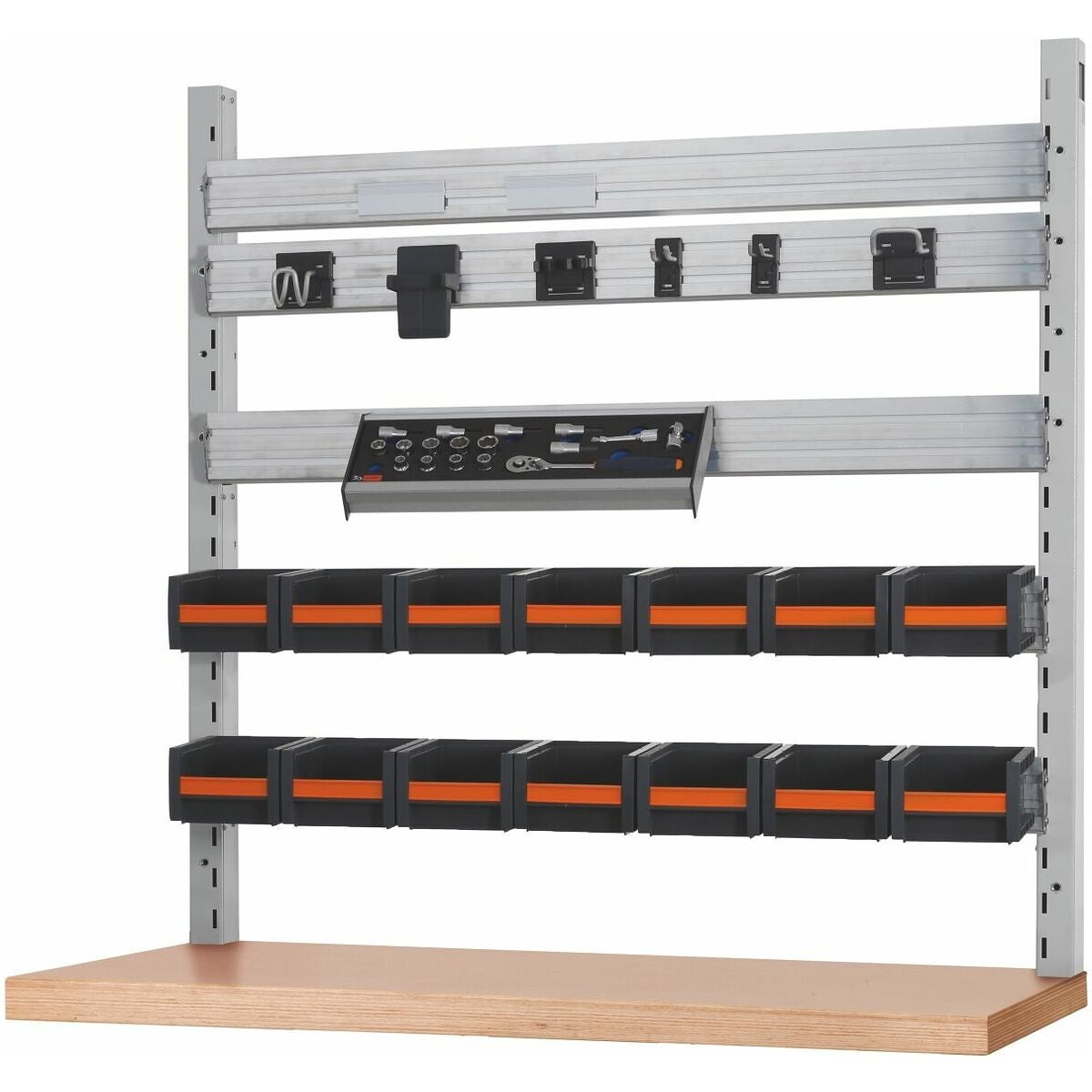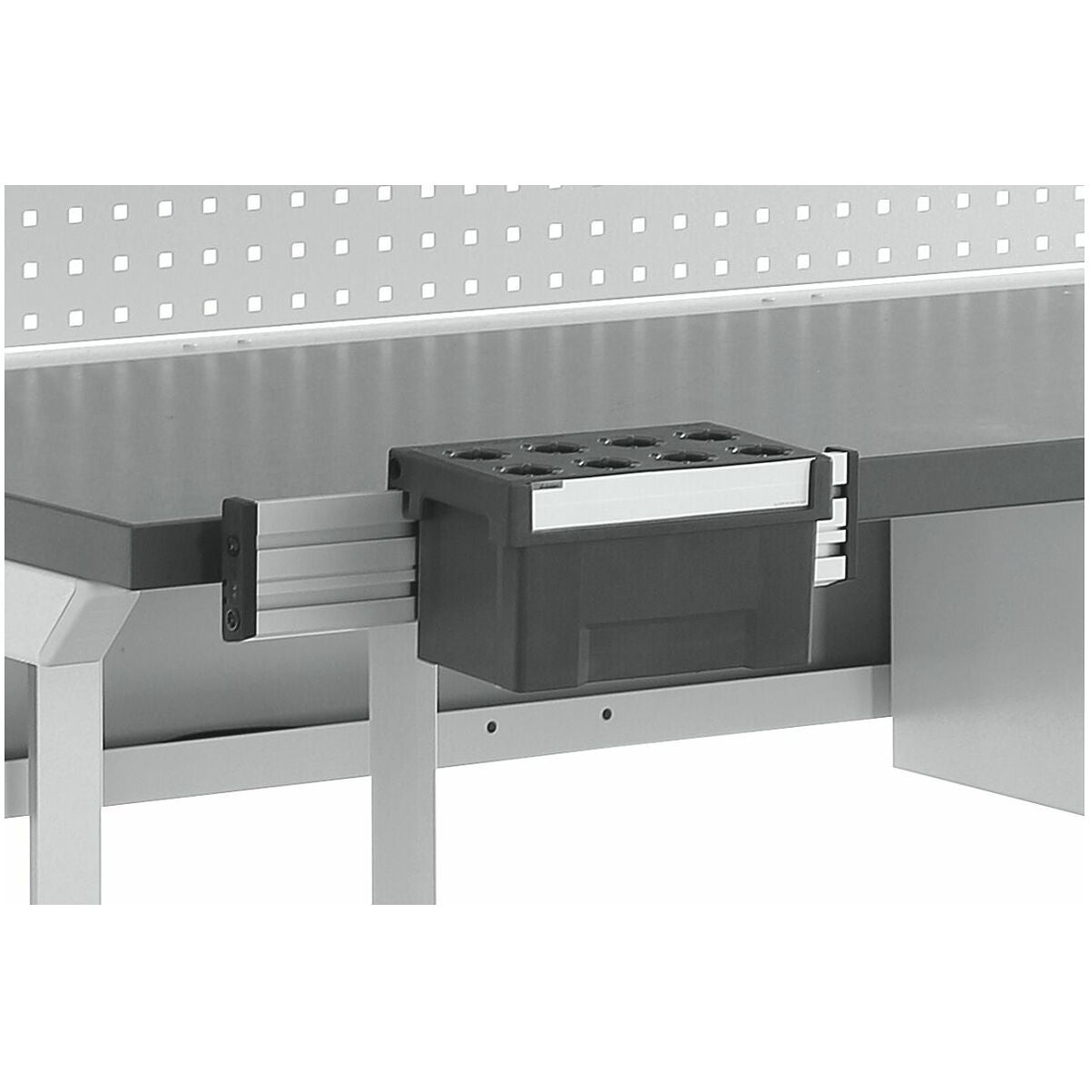 flerfunktionsskena av aluminium. För användning med GARANT easyFix krokar och hållare, öppna förvaringslådor, magnethållare och Shadowboards samt belysningsenhet nr 928630 (från storlek 1000). Montering sker genom upphängning.