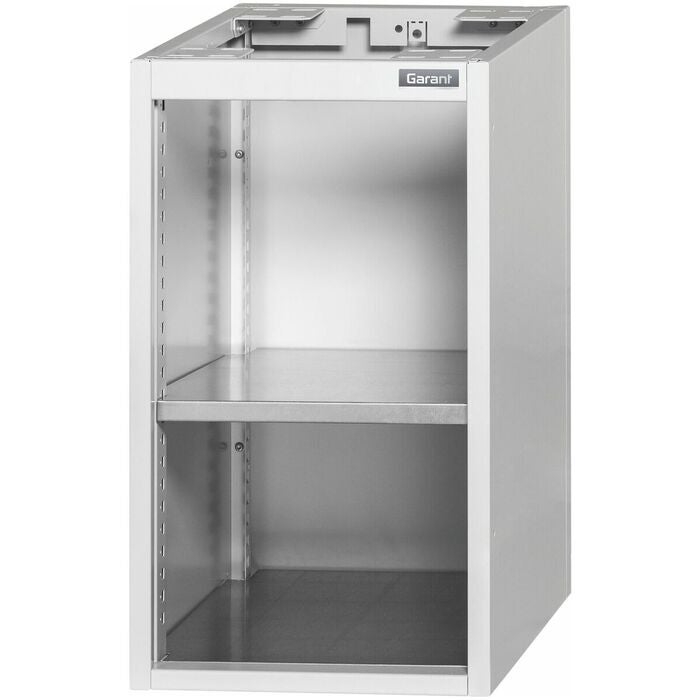 Öppen kåpa 16G i robust stålkonstruktion med genomgående bottenplåt och hylla.
