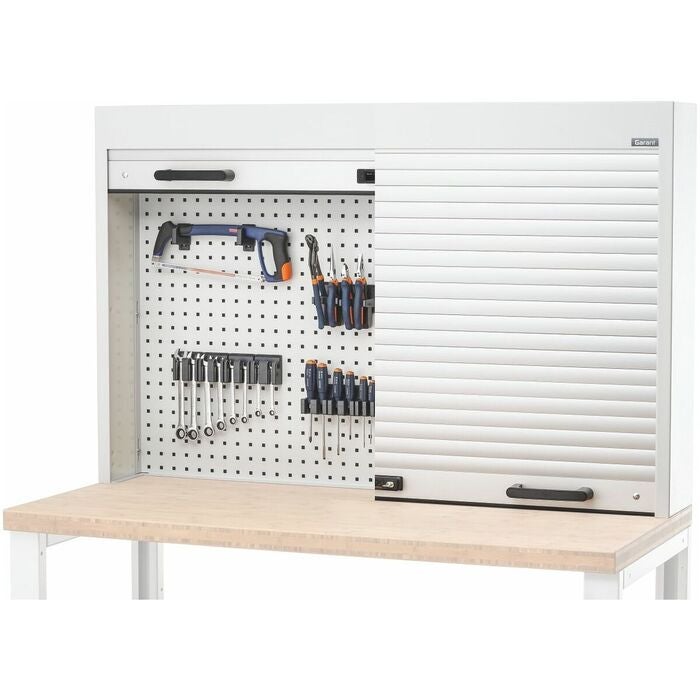 Stomme av stålplåt med dubbel bakvägg (dammskydd). Innersida med □ 9×9 mm i 37 mm-raster. Eloxerat jalusi med 2 plasthandtag och kantlist med cylinderlås.