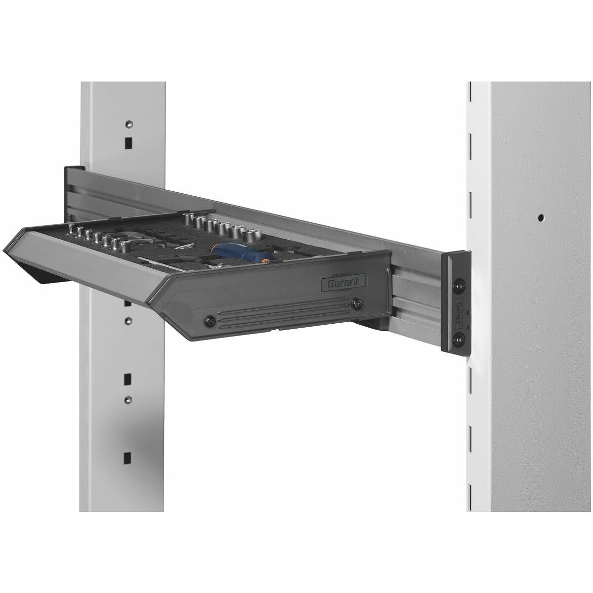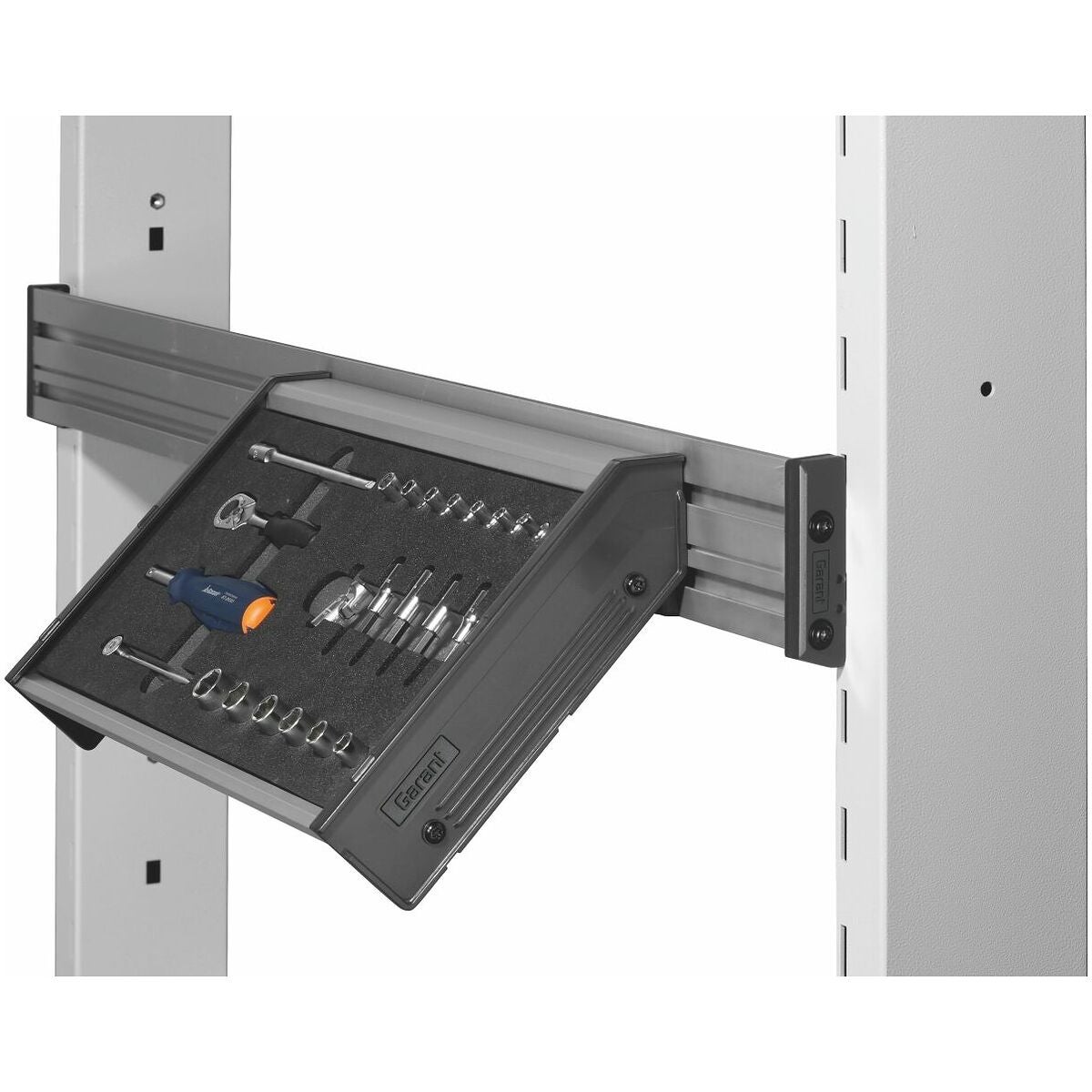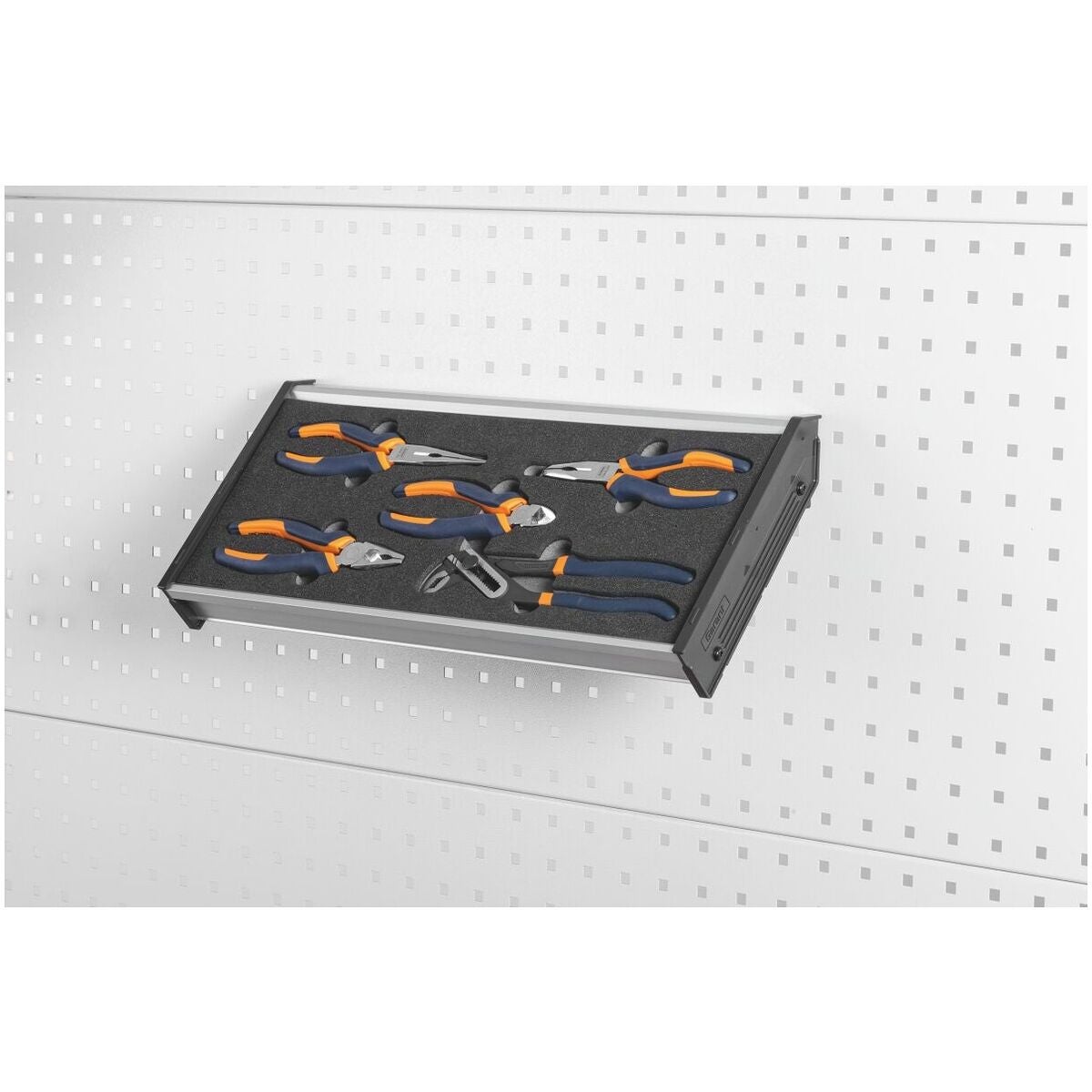 Aluminiumhylla. Kan hängas vågrätt och i 45° vinkel i den perforerade panelen samt i Mulitifix‑skenan. Shadowboard kan staplas.