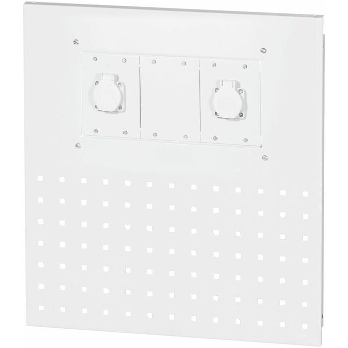 Sidoinklädnad för fotdel av falsad stålplåt, med perforerad panel □ 9×9 mm i 37 mm raster för fastsättning av GARANT easyFix krokar och hållare samt tillbehör för perforerad panel.