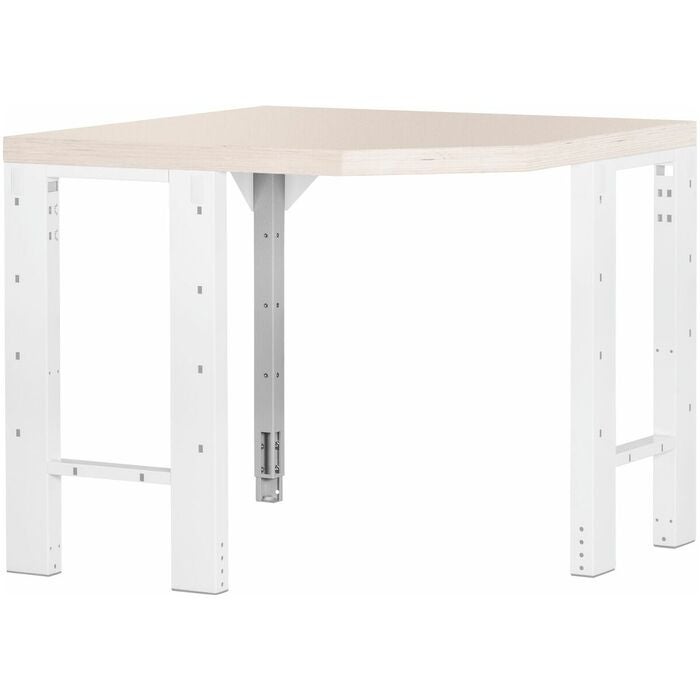Stödfot för hörnarbetsskiva av stålrör. Höjden inställbar i 50 mm raster från 750–1 050 mm. Med kabelgenomföringar för enkel och korrekt dragning av medialedningar/kablar.