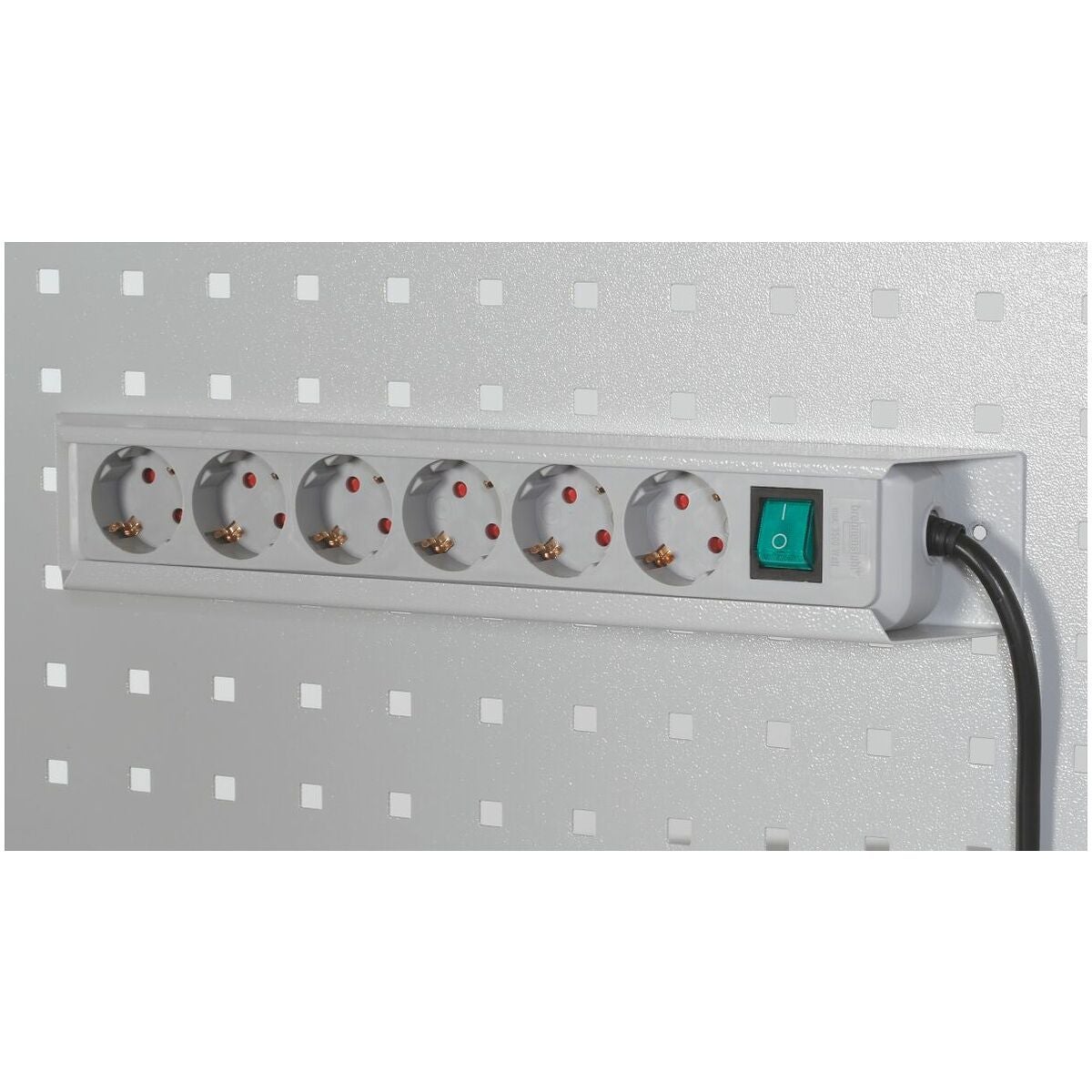 Hållare av stålplåt för fastskruvning på perforerad panel. Brennenstuhl grenuttag med belyst säkerhetsbrytare och 45° vridna uttagssocklar. 3500 W (16 A) märkeffekt.