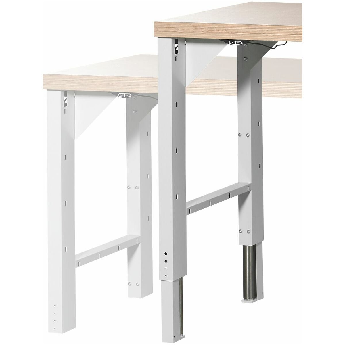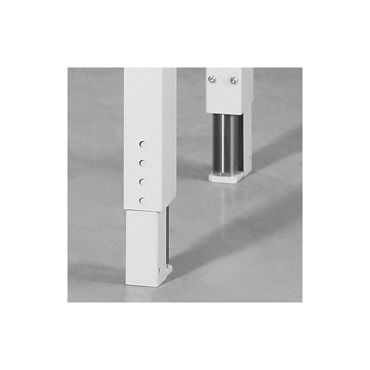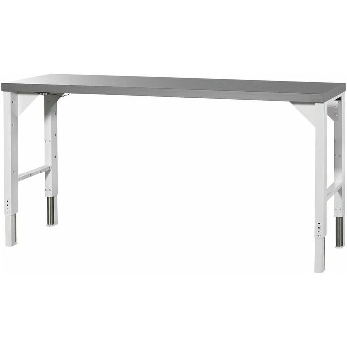 Arbetsbänk av stabil stålkonstruktion. Stödben 50 mm breda med tvärstagning. Med 2 par knutplåtar för förstyvning. Steglöst elektriskt höjdjusterbar. Höjdjustering med handknapp. Anslutningskabel med tysk jordad stickkontakt. Ansluten effekt 250 V / 50 Hz med högst 340 W.