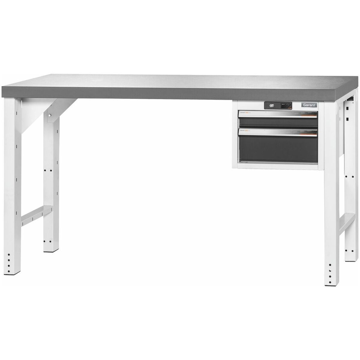 Arbetsbänk i robust stålkonstruktion. Fotdelar 50 mm breda med tvärstagning. Fötter med plastglidstöd skonsamma mot golvet. Med 1 par skarvplåtar för extra styvhet. Hurtshölje 16G med centrallås tack vare cylinderlås.