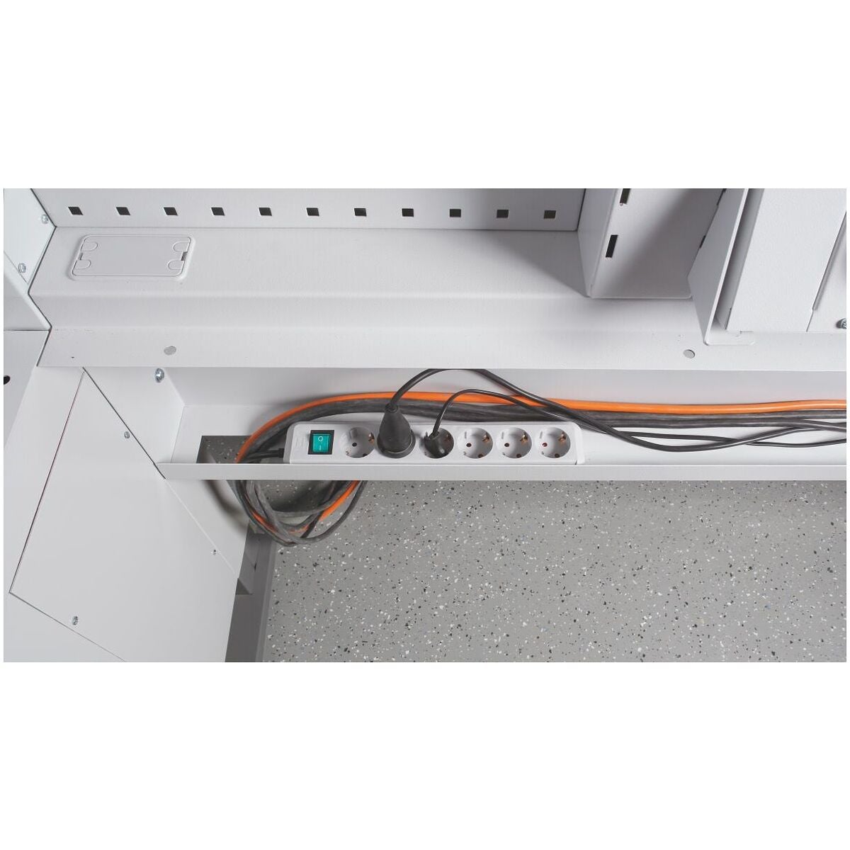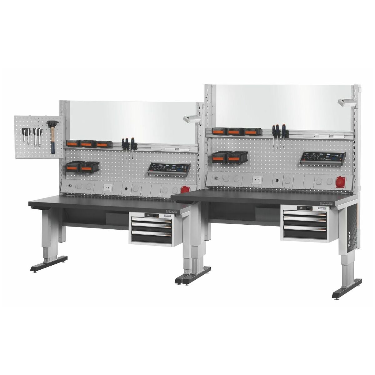 Workstation eLevel − elektrisk, steglös höjdinställning. Höjdinställning via elektronisk manöverpanel. Manöverpanel med display och minnesfunktion. Vid justering påverkas hela arbetsplatsens höjd.