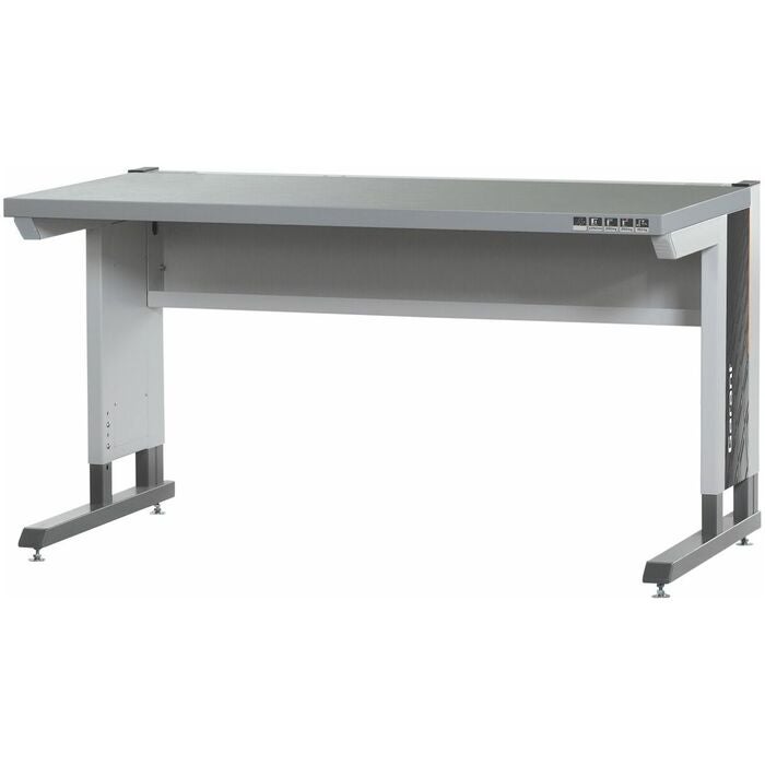 Workstation mLevel, arbetsplatsen som anpassar sig till dina behov. Klassisk manuell höjdinställning i 25 mm raster genom fotdel med fixeringsskruvar. Hela arbetsplatsen justeras. För enkel hantering finns en skala för den exakta arbetshöjden på bordets insida.
