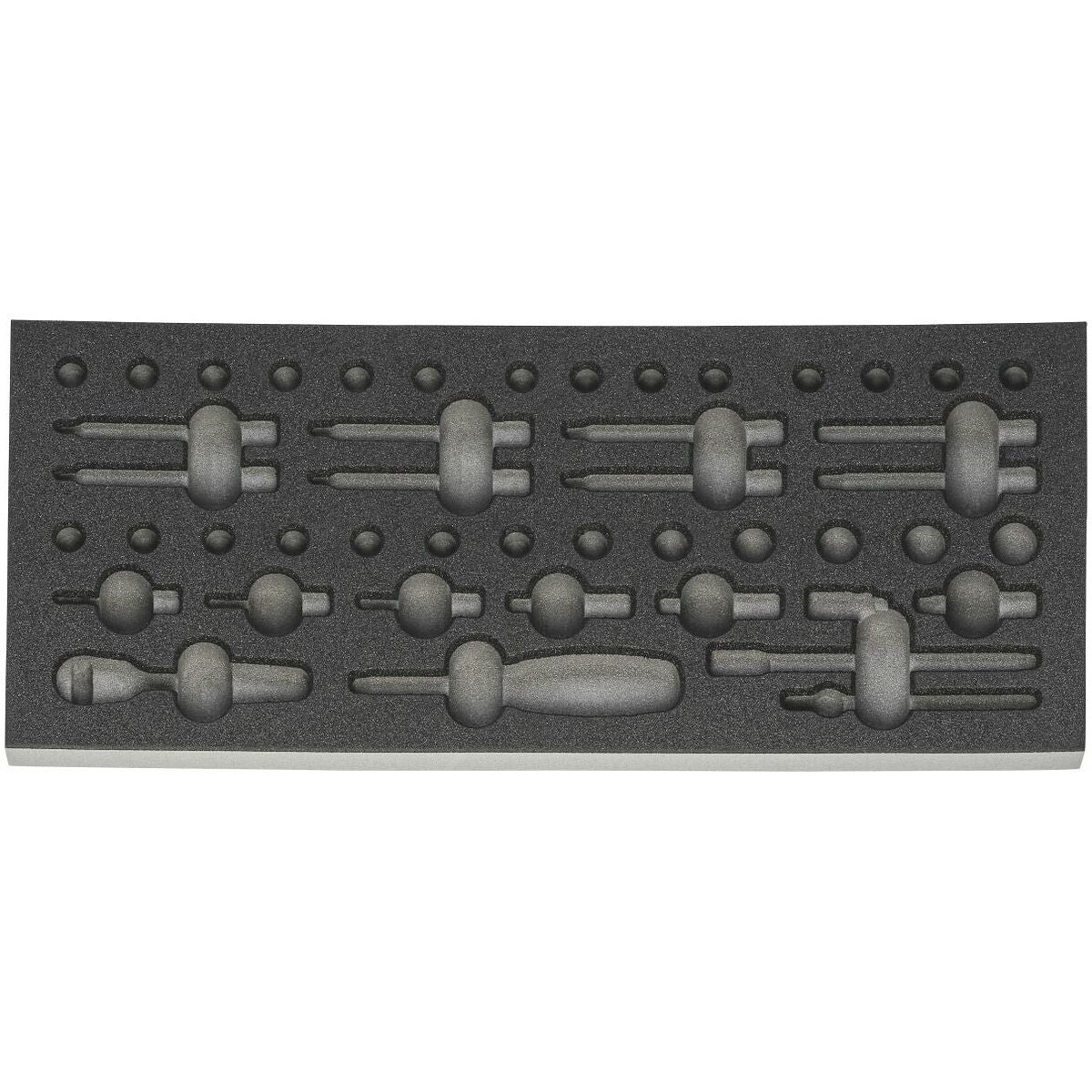 Vanliga verktygssortiment i tvåfärgade PE-cellplastinsatser. Cellplastens slutna porer gör att den är oljebeständig och inte tar åt sig några vätskor. Det översta skiktet är antracitgrått, den underliggande kontrastfärg grå visar om verktyg saknas.