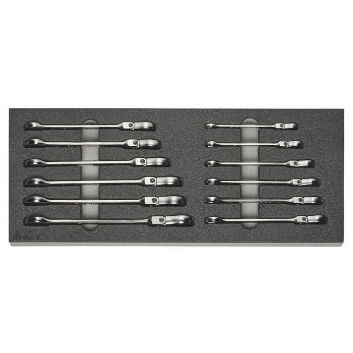 Vanliga verktygssortiment i tvåfärgad PE-cellplastinsats. Cellplastens slutna porer gör att den är oljebeständig och inte tar upp några vätskor.