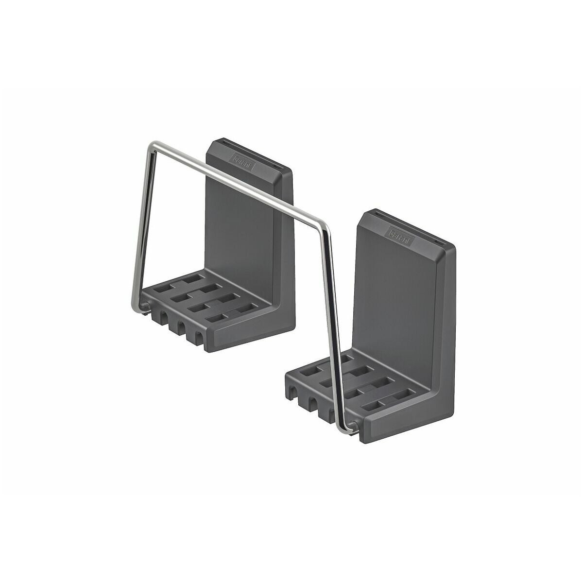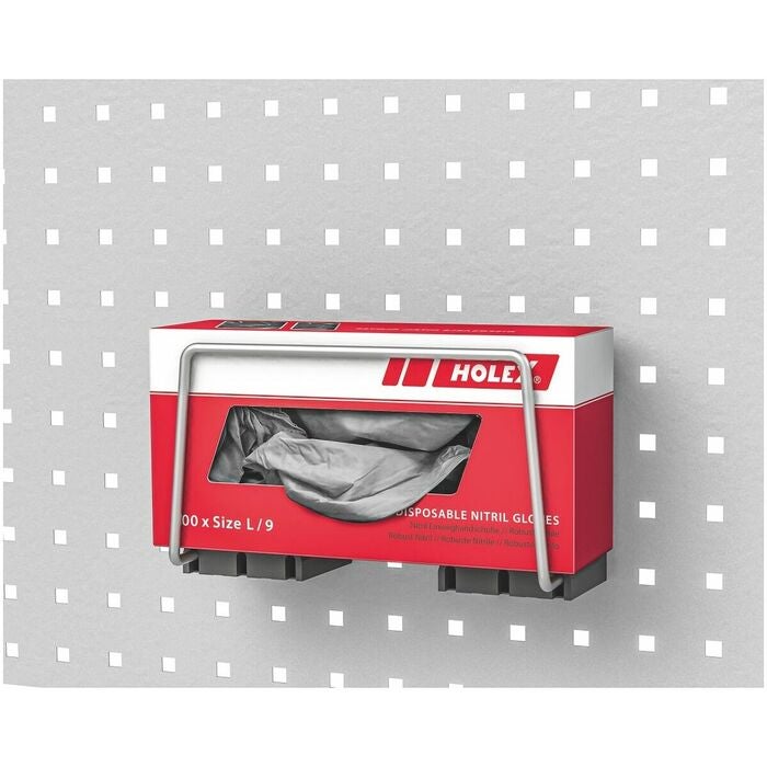 Dispenserhållare för engångshandskar, hörselproppar, ansiktsservetter etc. Trådhängaren kan justeras på djupet så att lådorna är stadigt fastspända och inte glider. Ståltråden kan flyttas i plasthållaren (fyra möjliga trådpositioner).