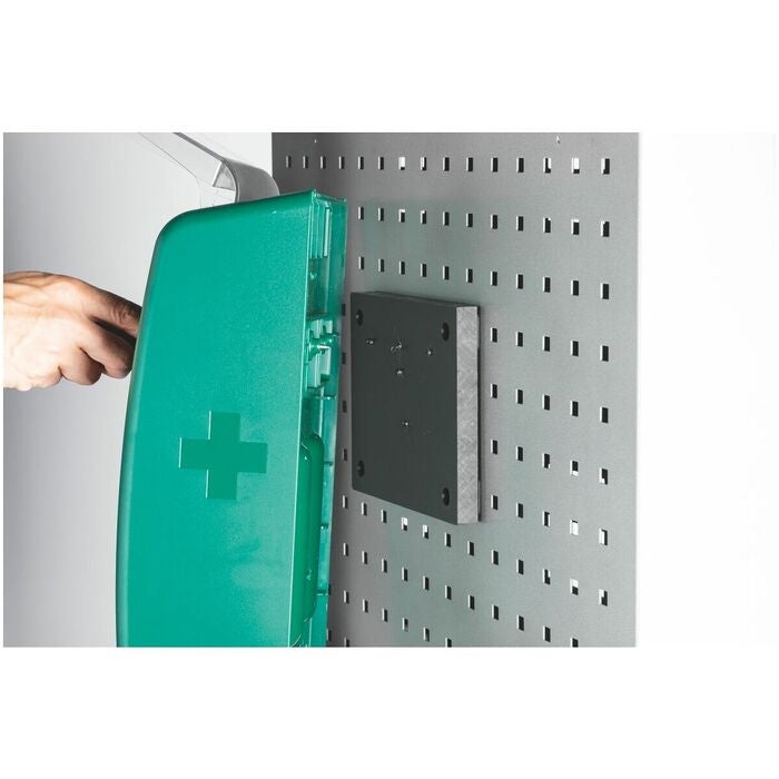 Plastplatta för fastsättning av t.ex. första hjälpen-station. Individuella fastskruvningsmöjligheter: Fastsättning av föremål som inte är kompatibla med perforerade paneler kan sättas fast genom förborrning i plattan. Plattan kan sättas fast på perforerade paneler med 4 GARANT easyFix plastpluggar. Den perforerade panelen skadas inte vid fastsättningen. Pluggen kan avlägsnas igen utan rester.