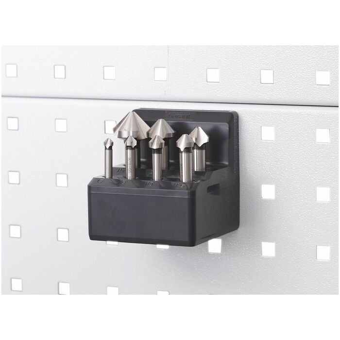 Överskådlig förvaring av 7 försänkare i 2 rader. Med storleksmärkningar. Kan även användas stående på arbetsskivan.