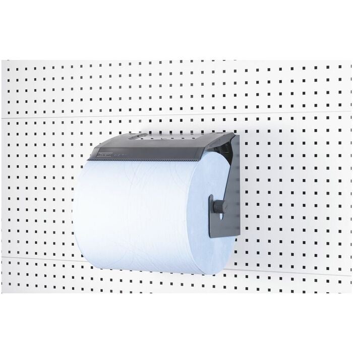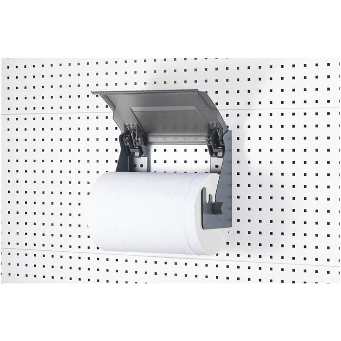Synnerligen robust och stabil pappersrullhållare med 2 konsoler av stålplåt. Med aluminiumaxel ⌀ 32 mm med ändkåpor av plast. Uppfällbart lock med rivkant och fasthållning i öppet läge för bekvämt byte av rullar. Pappersrullen kan hängas upp i 2 lägen.