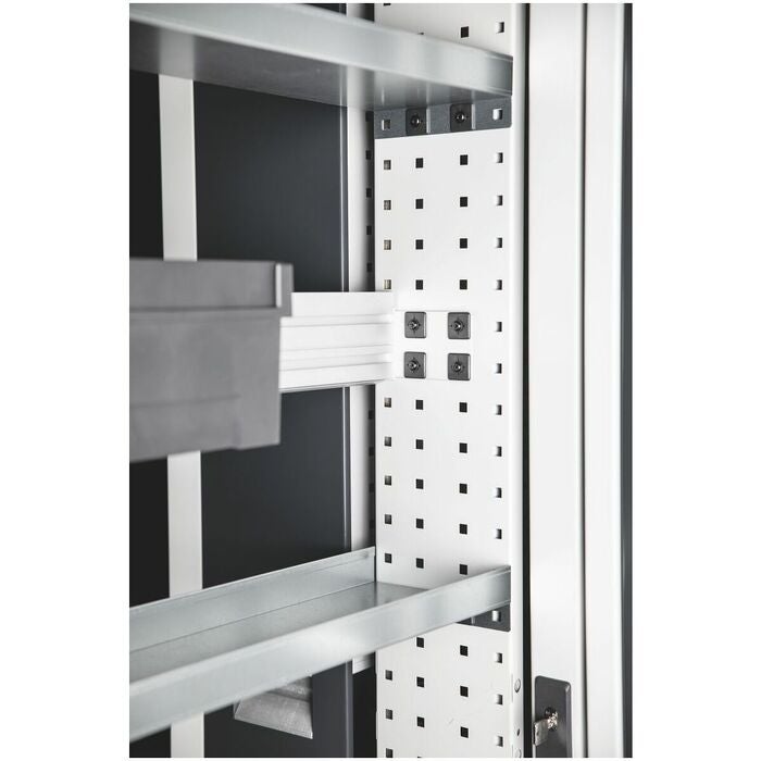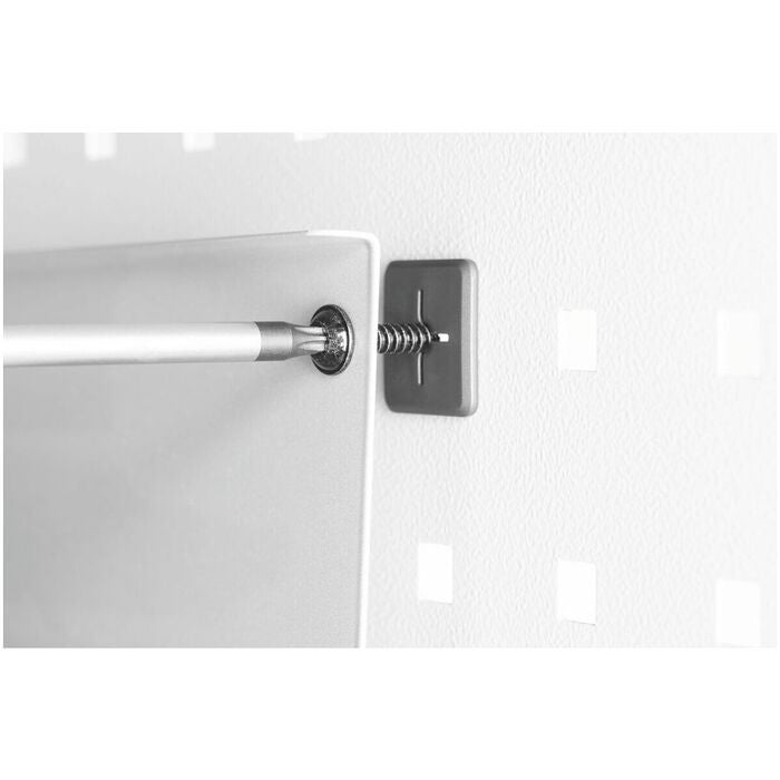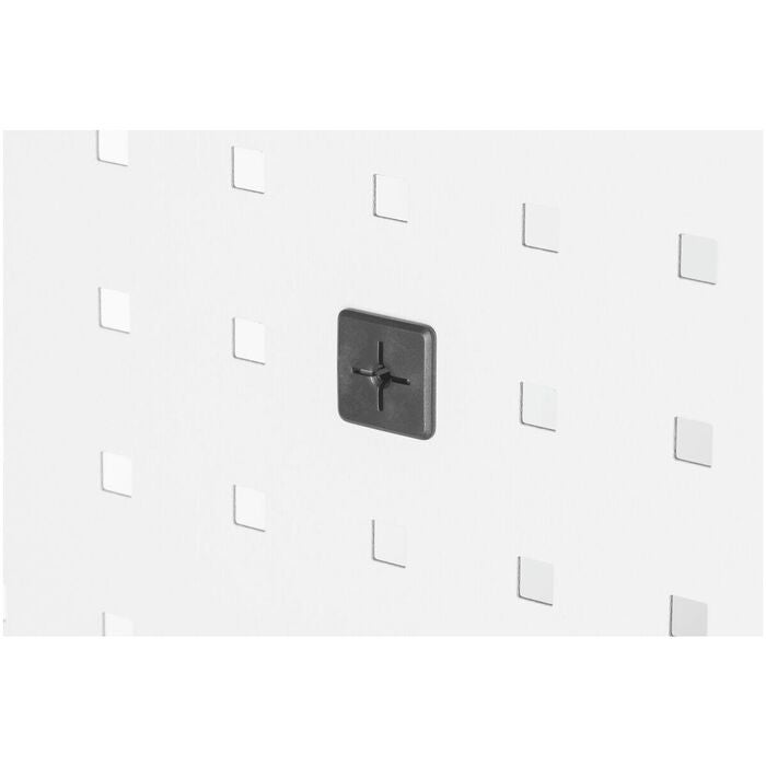 Plastplugg för fastsättning i perforerade paneler. Den perforerade panelen skadas inte vid fastsättningen. Pluggen kan avlägsnas igen utan rester. Individuella fastskruvningsmöjligheter: Föremål som inte är kompatibla med perforerad panel kan fästas. Pluggens anliggningsyta: 1G×1G. Rekommenderad skruv-⌀: 5 mm.