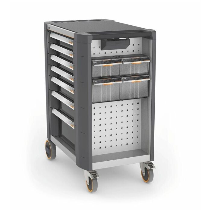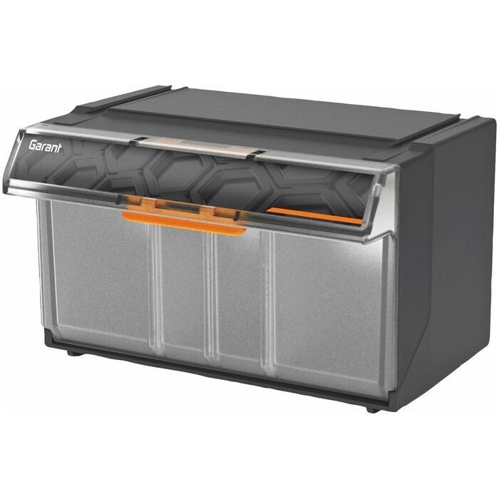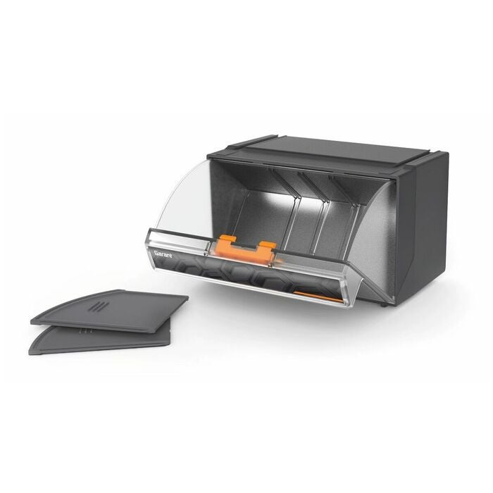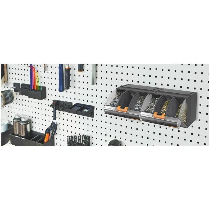 Tippbar box av plast med 2 antracitfärgade skiljeväggar som valfritt kan stickas in för ytterligare indelning av boxen. Lådan kan då delas in i 2 eller 3 fack. Transparent, löstagbar låda med skrivbar etikettremsa. Lådan är säkrad med ett handtag och låst i stängt tillstånd. Tippbara boxar kan staplas utan att glida. Med de 2 skruvhålen på baksidan kan boxen alternativt monteras på vägg (montagematerial ingår inte i leveransen).