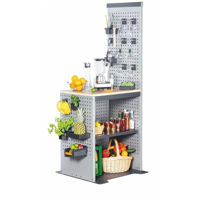 Halvhögt GARANT Uni Line Z-Tower med 25 mm tjock avställningsskiva av bambu. På alla in- och utsidor perforerade paneler □ 9×9 mm i 37 mm-raster för fastsättning av tillbehör till perforerade paneler och GARANT easyFix krokar och hållare. På baksidan med borstlist för kabelgenomstick samt extra kabelgenomföring. Representativt modulärt utlämningssystem för direkt åtkomst till arbetsmaterial och snabb visualisering av information. Variabel och universellt användbar för olika tillämpningar och utrustningar. 2 sidväggar med bakvägg.