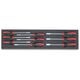Vanliga verktygssortiment i tvåfärgade PE-cellplastinsatser. Cellplastens slutna porer gör att den är oljebeständig och inte tar upp några vätskor.