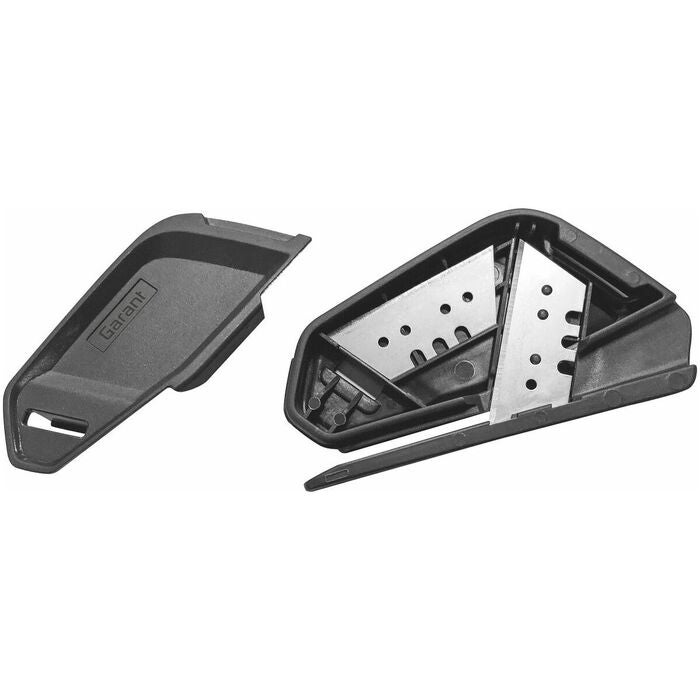 Skärhjälpmedel med vändklinga och en inneliggande reservklinga. Klingstorlek 50×19×0,4 mm.