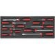 Vanliga verktygssortiment i tvåfärgad PE-cellplastinsats. Cellplastens slutna porer gör att den är oljebeständig och inte tar upp några vätskor. Täckskiktet är antracitfärgat, den underliggande grå kontrastfärgen visar om verktyg saknas.