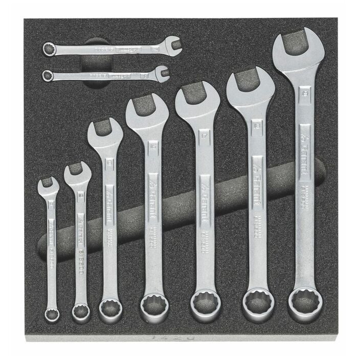 Vanliga verktygssortiment i tvåfärgade PE-cellplastinsatser. Cellplastens slutna porer gör att den är oljebeständig och inte tar upp några vätskor.