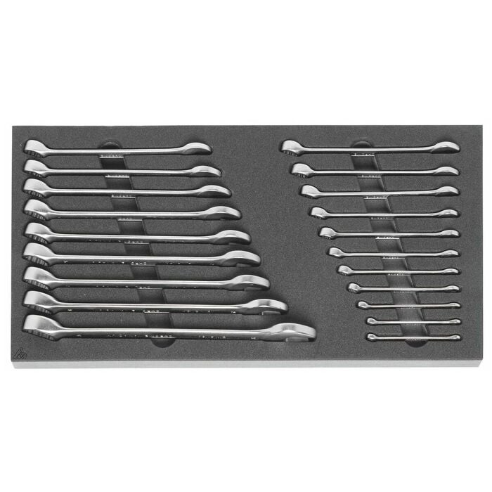 Vanliga verktygssortiment i tvåfärgade PE-cellplastinsatser. Cellplastens slutna porer gör att den är oljebeständig och inte tar upp några vätskor.