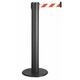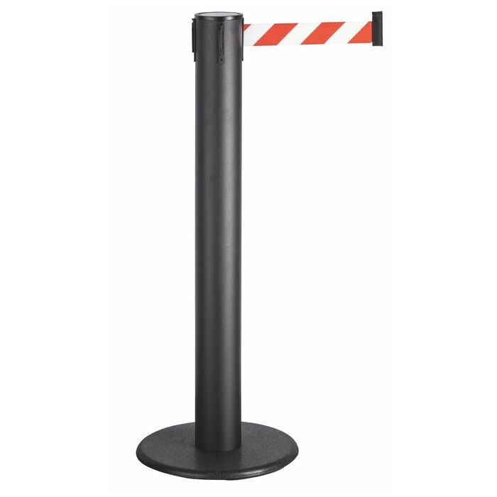 Avspärrningsstolpe för inomhusbruk. Idealisk när stora ytor behöver spärras, genom 10 m bandlängd som medger många olika användningsalternativ med växlande distanskrav. Golvtallrik av gjutjärn, tallriksöverdrag av svart plast, stolprör av metall.