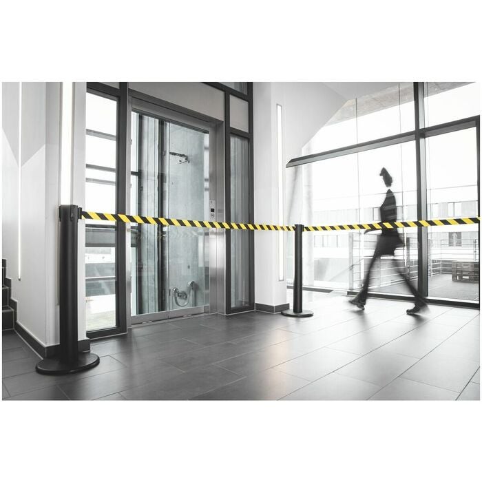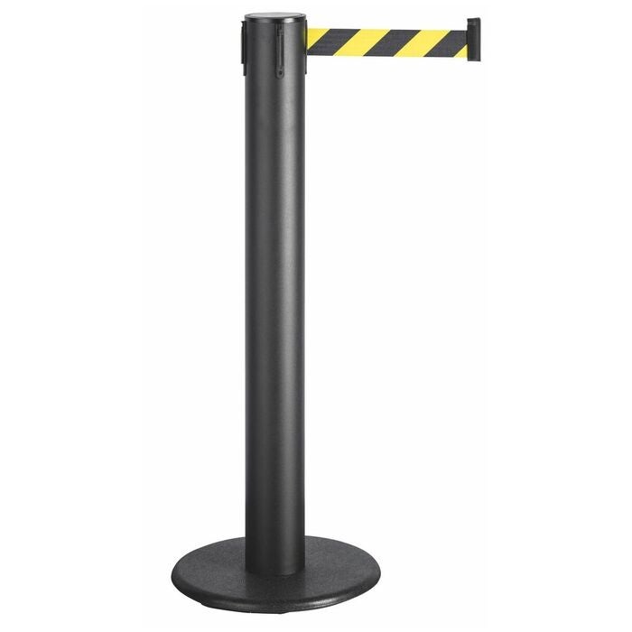 Avspärrningsstolpe för inomhusbruk. Idealisk när stora ytor behöver spärras, genom 10 m bandlängd som medger många olika användningsalternativ med växlande distanskrav. Golvtallrik av gjutjärn, tallriksöverdrag av svart plast, stolprör av metall.