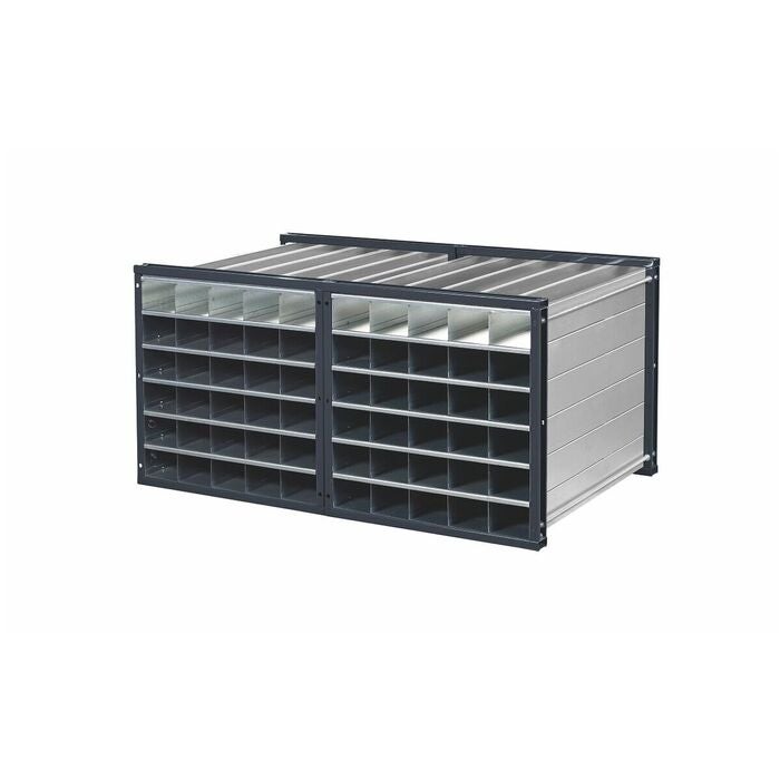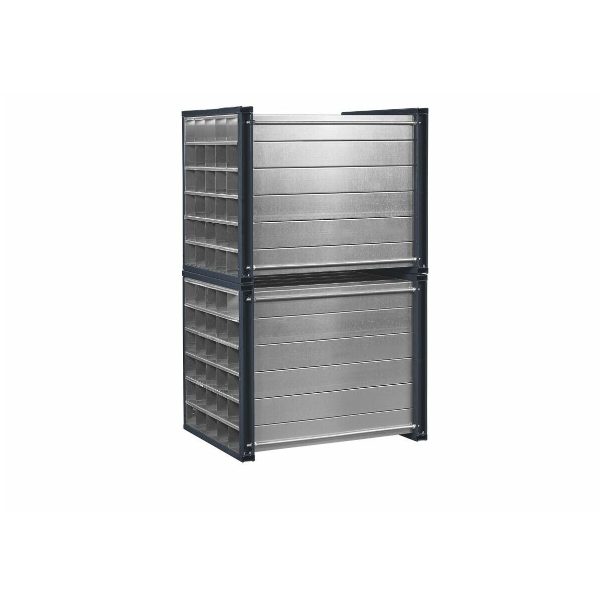 Pulverbelagd ram med genomgående hyllplan av förzinkad stålplåt. Staplingsbart 1 gång på höjden fritt utbyggbart i sidled. Inklusive textremsor.
