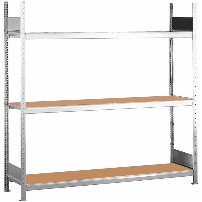 Förzinkade T-profilramar. Med hyllplan av 19 mm spånskivor. Hyllplanen inställbara i 25 mm raster. Tvärbalkarna sticks enkelt in för snabb montering. Maximal last per hyllplan: 400 kg.