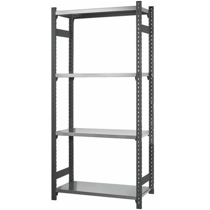 Stabil stolpram av rektangulära profiler (50×25×1,25 mm) med upphängningsslitsar i 40 mm raster för infästning av tvärbalkar/hyllor. Stolpramar med ändlock av plast. Hopsättningen sker genom insticksmontering utan verktyg. Tack vare den höga sidostabiliteten behövs inga diagonalsträvor för stabiliseringen. Hyllor av förzinkad plåt.