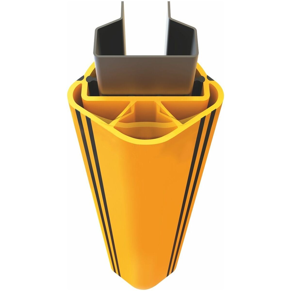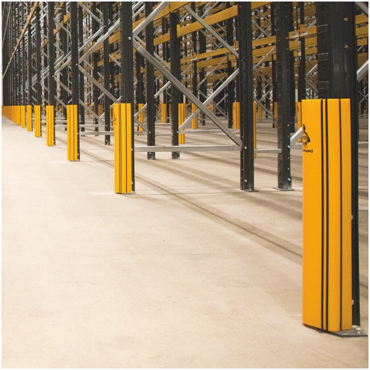 Hyllställsstolpskydd RackGuard™ skyddar stötkänsliga hyllställsstolpar mot stötar framifrån och från sidan samt mot repor som orsakas av arbetsfordon. Kollisionsenergin leds kring foten istället för rakt igenom, vilket minskar skadorna och bibehåller hyllställsystemens stabilitet. Gummiinlägg svarar för ett säkert fäste mot vanligen förekommande hyllställsstolpar. Bikakstruktur som dämpar stötar. Största kollisionsenergi vid 90°: 1000 joule. Kollisionszon 0 – 600 mm. Deformation vid maximal energi: 20 mm. Mycket hög klimat- och färgbeständighet.