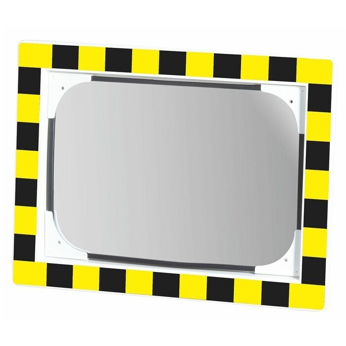 För mer säkerhet vid oöversiktliga trafikvägar, utan förvrängning. Slagfast polyesterram med reflekterande svartgul 3M-folie.