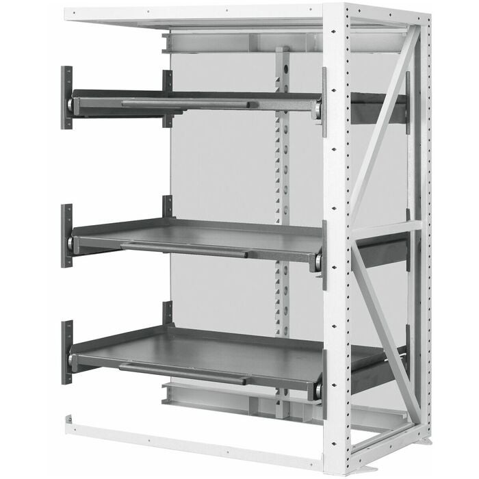 Stolpramar med 100 mm bred C-profil är försedda med 3 eller 4 helt utdragbara hyllor (100 % utdrag). Infästningshål i 50 mm raster.