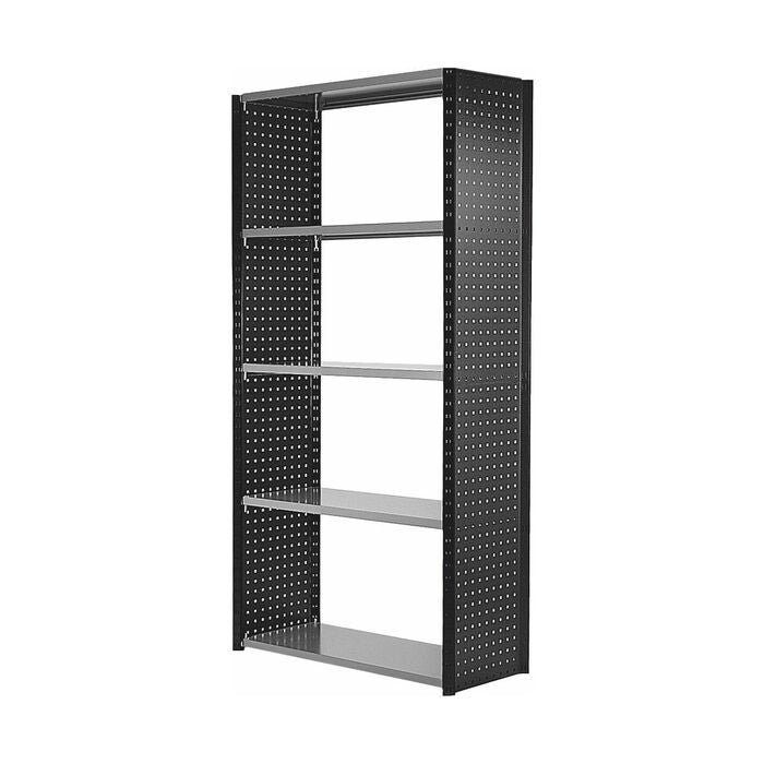 Med □ 9×9 mm i 37 mm raster för krokar och hållare samt tillbehör till perforerade paneler. Dessa finns i grupp 95. En sidvägg består av två perforerade plåtpaneler som fästs ovanpå varandra. Levereras komplett med fästmaterial.