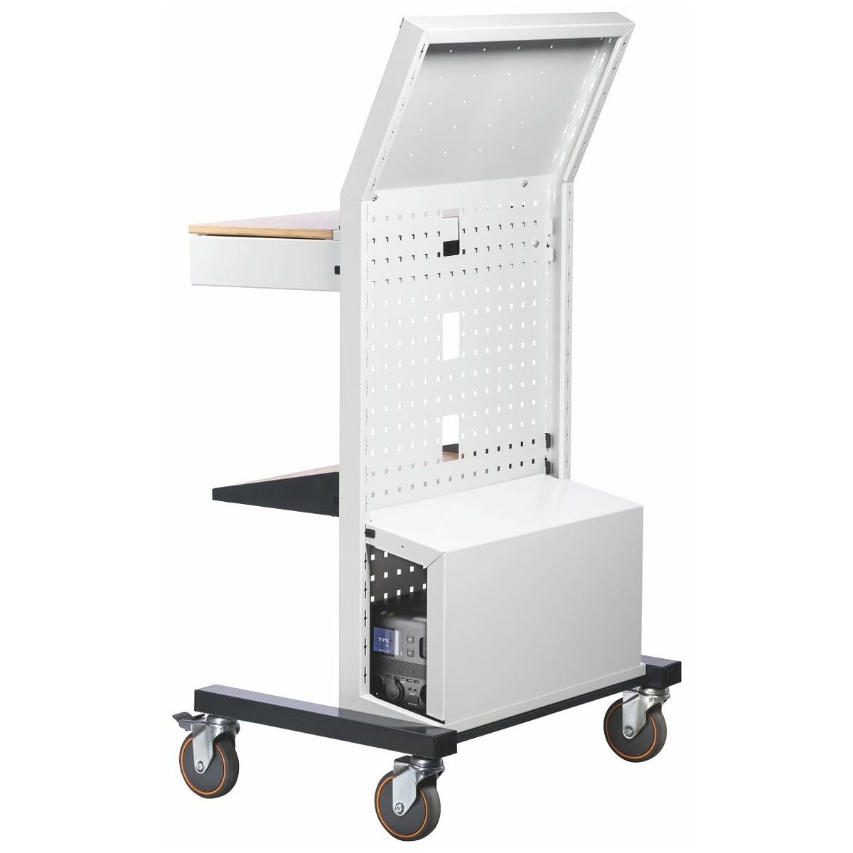 Skydd för baksidan av datorbordet. Power Station nr 957650 strl. 1500 kan stuvas under skyddet och är därför skyddad från yttre påverkan. Med 2 plastspärrar.
