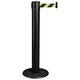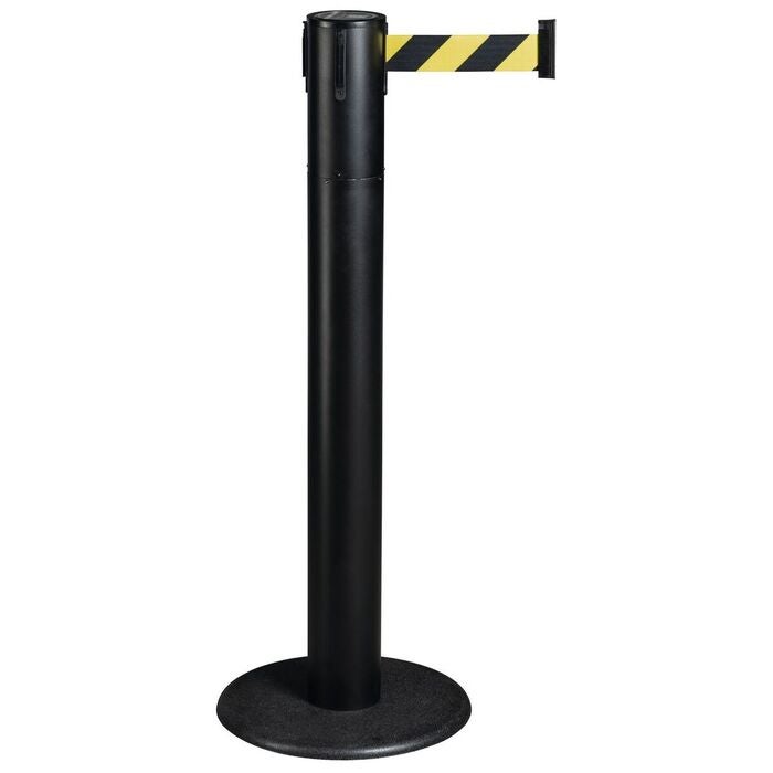 Spärrstolpe med dubbelsidigt vridbart huvud (360°) för inomhusbruk. Idealisk när stora ytor behöver spärras, genom 9 m bandlängd som medger många olika användningsalternativ med växlande distanskrav. Golvtallrik av gjutjärn, tallriksöverdrag av svart plast, stolprör av metall.