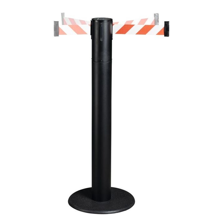 Spärrstolpe med dubbelsidigt vridbart huvud (360°) för inomhusbruk. Idealisk när stora ytor behöver spärras, genom 9 m bandlängd som medger många olika användningsalternativ med växlande distanskrav. Golvtallrik av gjutjärn, tallriksöverdrag av svart plast, stolprör av metall.
