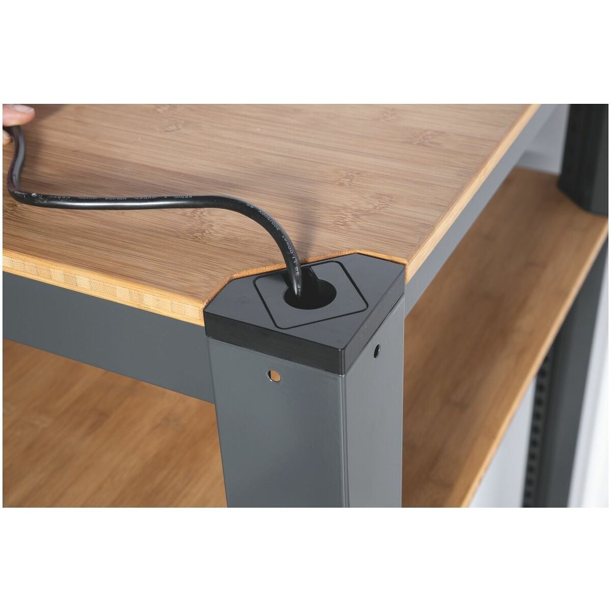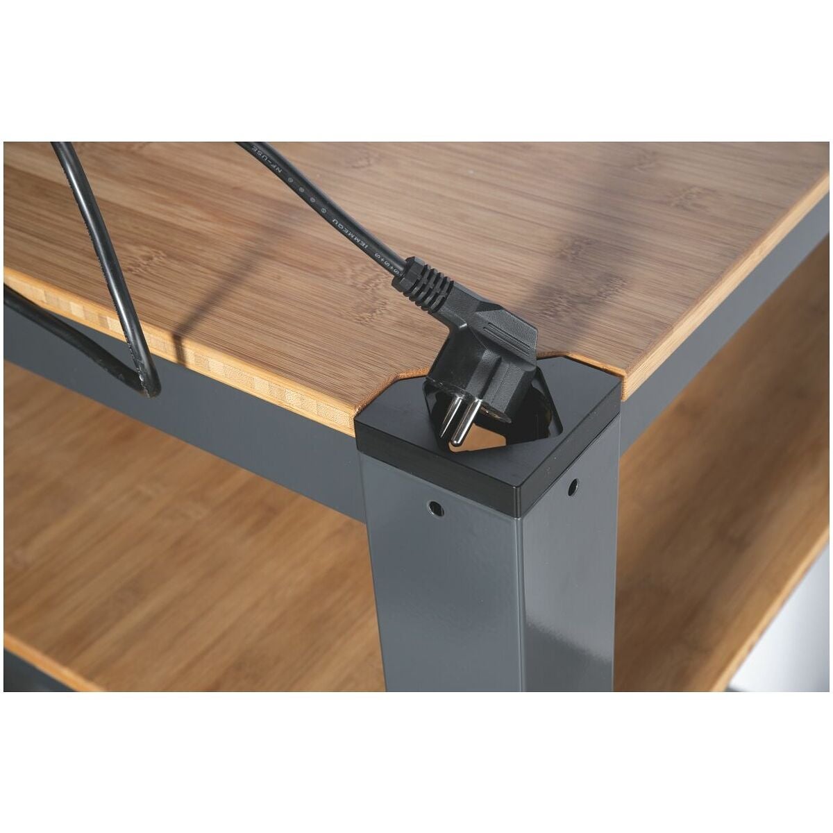 Ståbord av kantad stålplåt profil med integrerade kabelrännor under bordskivan. Med 2 kabelgenomföringar i bordsbenen (passar till Schuko-pluggar). Arbetsskiva och mellanhylla av 25 mm tjock bambuplatta, inoljad utan restprodukter. Den undre hyllan är höjdjusterbar.