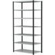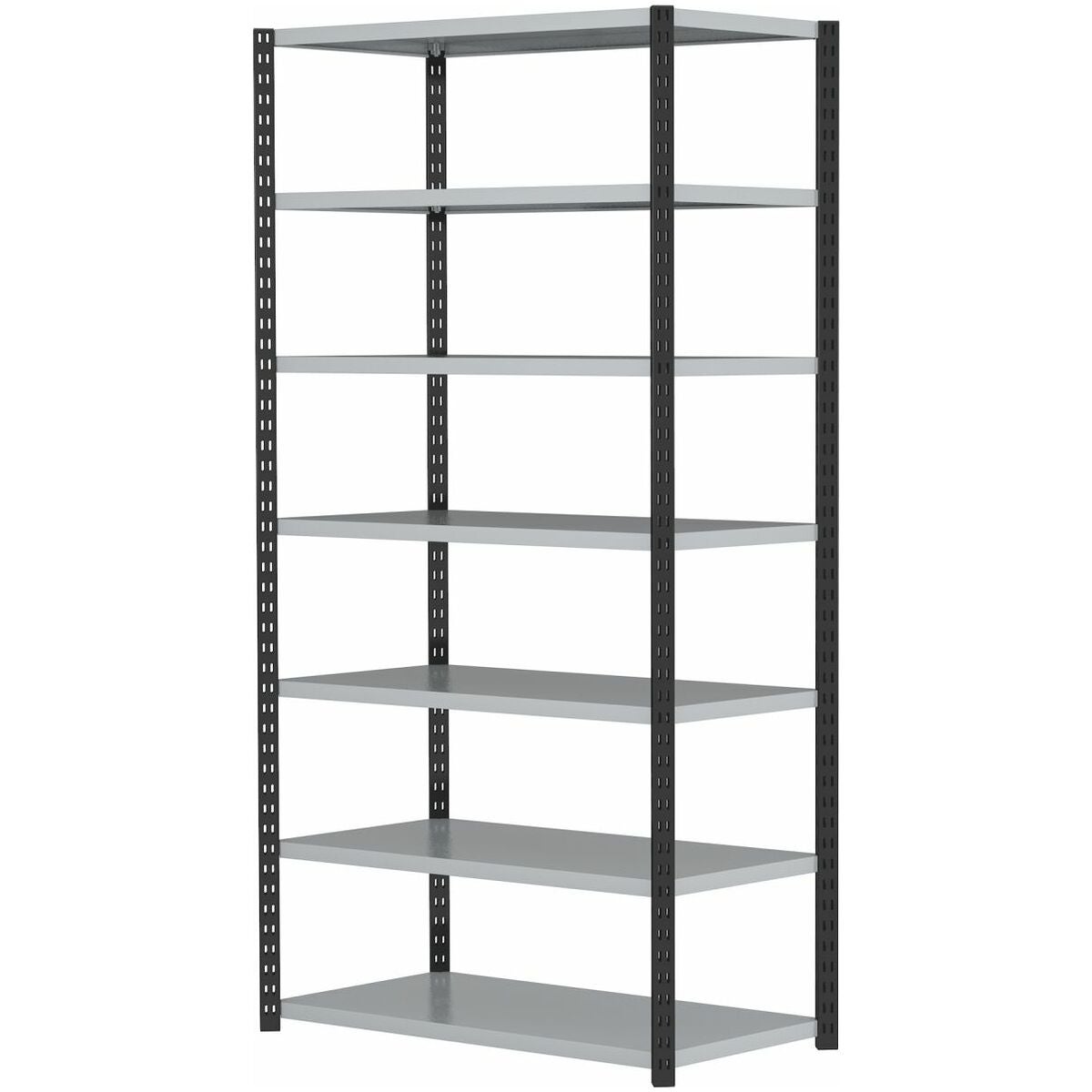 Hyllställstolpar i kolsvart RAL 9005, grå hyllor, pulverbelagda.
