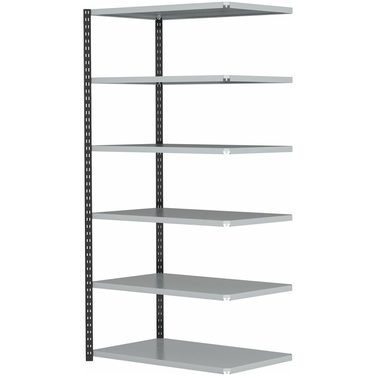 Hyllställstolpar i kolsvart RAL 9005, grå hyllor, pulverbelagda.