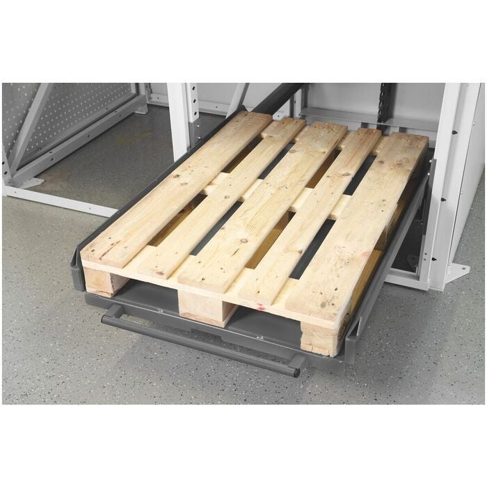 Dessutom sker en låsning på sidorna genom bultar i stativramen. Denna låsning griper in när utdragshyllan är inskjuten. Låsningen lossas genom att ett handtag under skjuthandtaget dras ut (enhandsmanövrering). I helt utkört tillstånd låses utdragshyllan på nytt i löpskenorna (dubbel låsning). Lastning med kran är möjlig tack vare att utdragshyllan är låst.