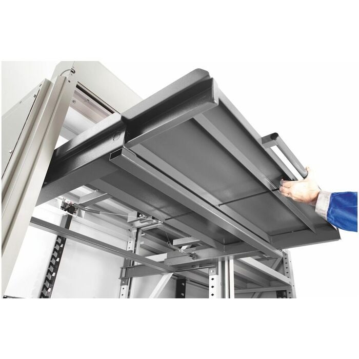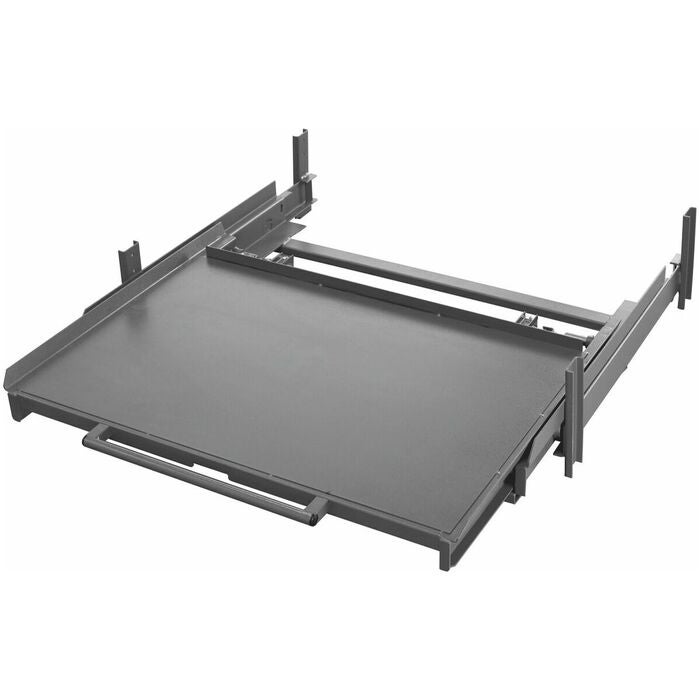 Utdragshylla med skyddskant på 3 sidor (35 mm hög) och praktiskt skjuthandtag. Montering i 50 mm raster möjlig. Utdragshyllan kan även monteras bakom en dörrsats.