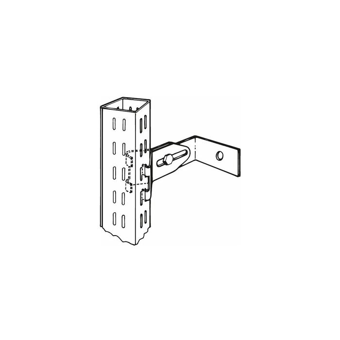 För infästning av hyllställ mot vägg för att förhindra vältning. Väggavståndet inställbart från 70 till 105 mm.