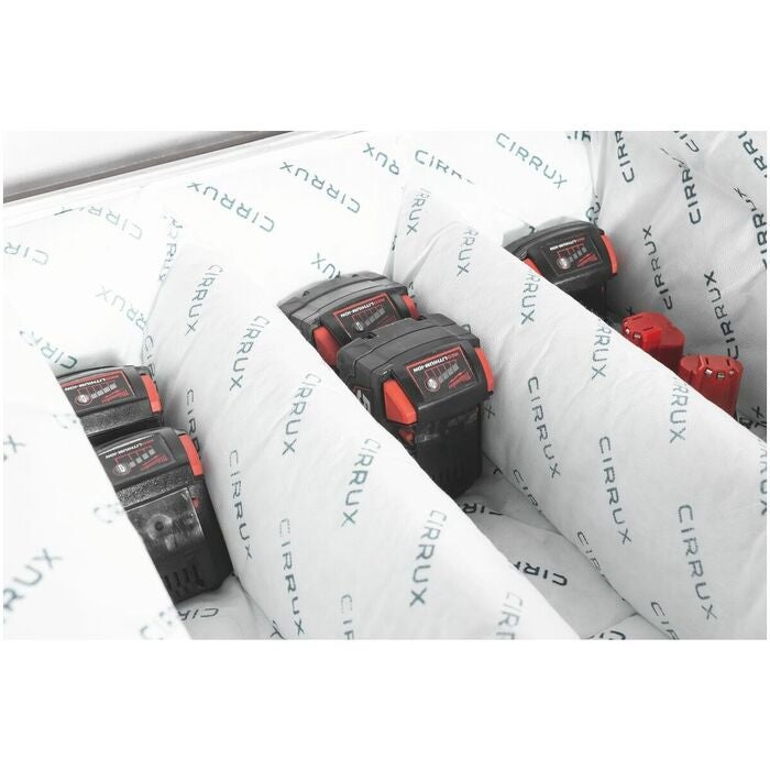 Godkännande för kritiskt defekta litiumjonbatterier upp till 814 Wh. Inomhusanvändning: 3 fack. Lågorna griper inte över på närbelägna batterier.
